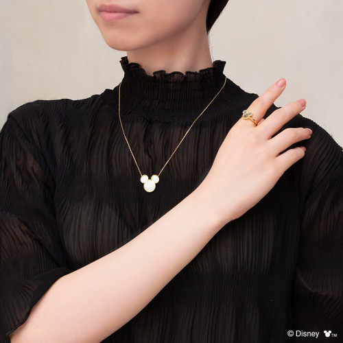 このほどの新作は、イエローゴールドカラーで「ミッキーマウス」のアイコンをかたどり、マザーオブパール(白蝶貝・黒蝶貝)が、ほど良いボリューム感で優しくきらめきます。“大人になっても大好きな「ミッキーマウス」のデザインをシンプルに楽しみたい”という方に向けた、自然界の素材ならではの柔らかい光沢がエレガントなジュエリーです。