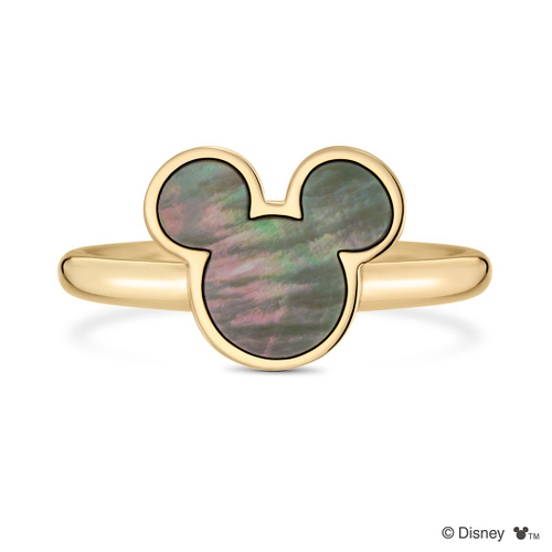 「ミッキー」のアイコンをかたどったマザーオブパールがエレガントにきらめくリング。アイコン部分は縦が1cmほどの大きさで、手元でパッと目を惹く存在感があります。