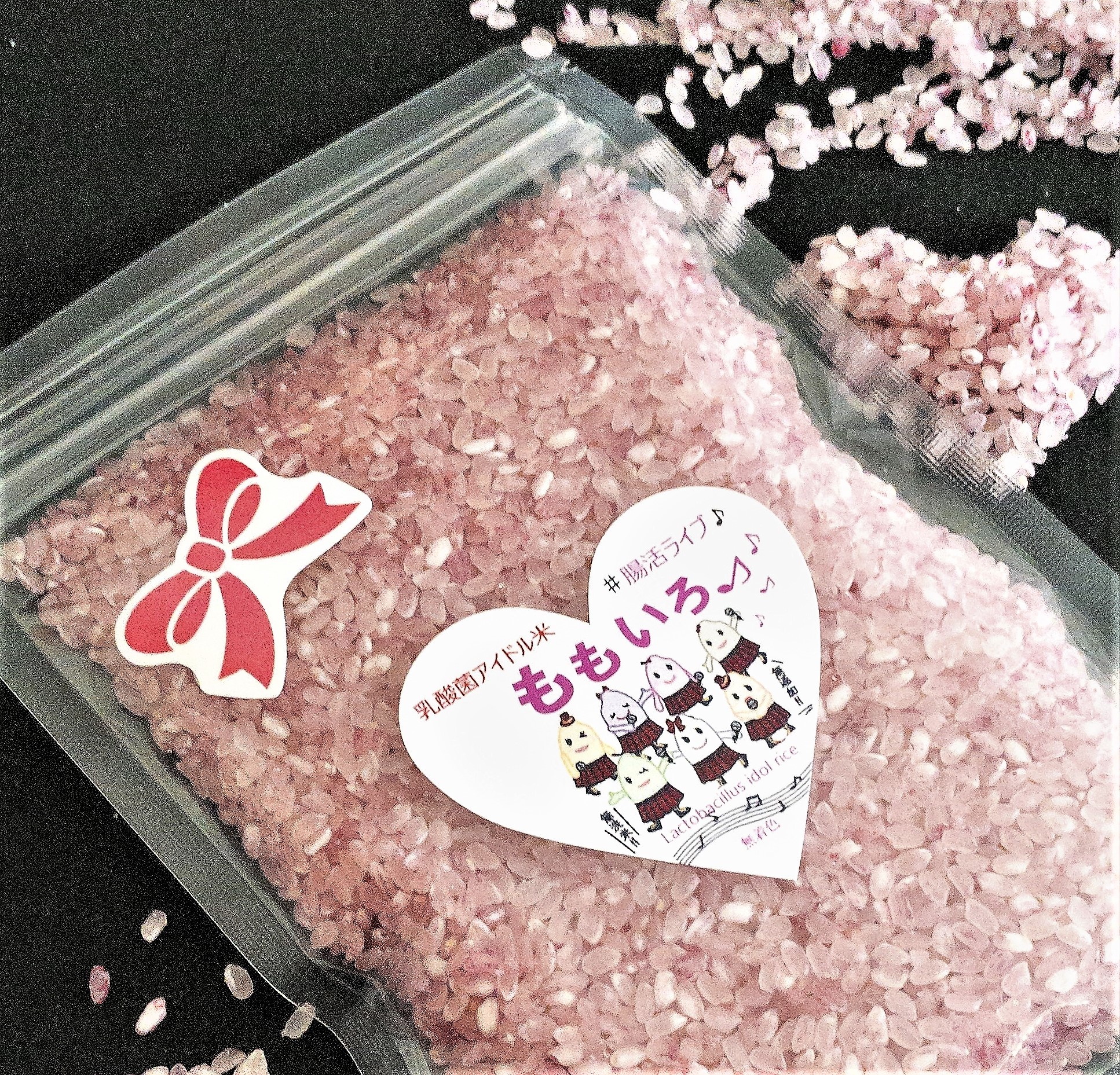 無洗白米をお米由来の機能性表示乳酸菌K-1・オリゴ糖・水溶性食物繊維(寒天)・美容素材(コラーゲン・紫芋)で包んだピンクの腸活美容米で、炊いたらピンクの甘いアイドル風味のご飯です。