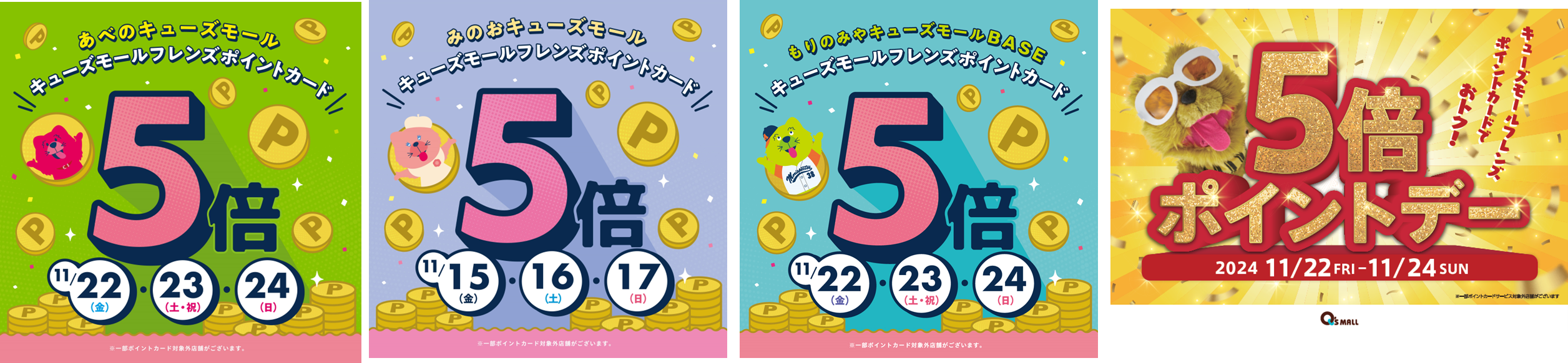 内容:期間中、通常100円(税込)で1ポイント貯まるキューズモールフレンズポイントカードのポイントが5倍となるキャンペーンを実施します。