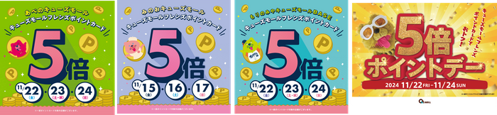 「ブラックフライデーセール」では、まとめ買い特別セールの実施や、サイコロの出た目によって割引額が変わるチャレンジ企画を実施する店舗など、キューズモール4施設の合計約180店舗が参加予定で、期間限定でお得なお買い物をお楽しみいただけます。さらに3日間限定で全施設にて、お買い物でキューズモールフレンズポイントカードのポイントが5倍となるキャンペーンも実施します。