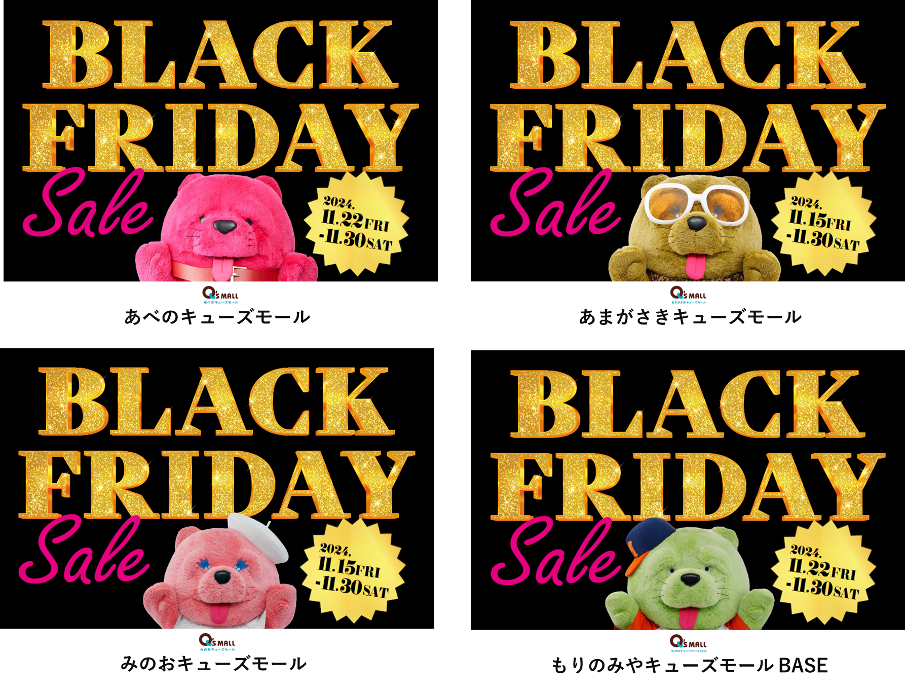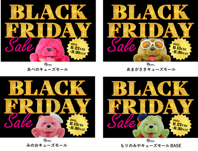 「キューズモール」4施設(あべのキューズモール・あまがさきキューズモール・みのおキューズモール・もりのみやキューズモールBASE)の各施設では、2024年11月中旬より順次、お得にお買い物をお楽しみいただける「BLACK FRIDAY SALE(ブラックフライデーセール)」を実施します。