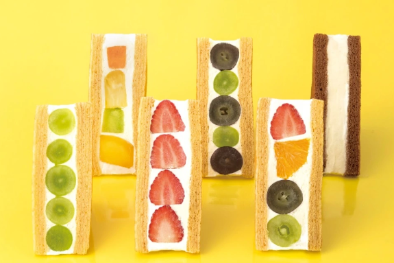 世界初!バウムクーヘンで作ったフルーツサンド。シート状に焼いたバウムクーヘンで、マスカルポーネチーズ入りの特製クリーム、旬のフルーツをサンドしました。