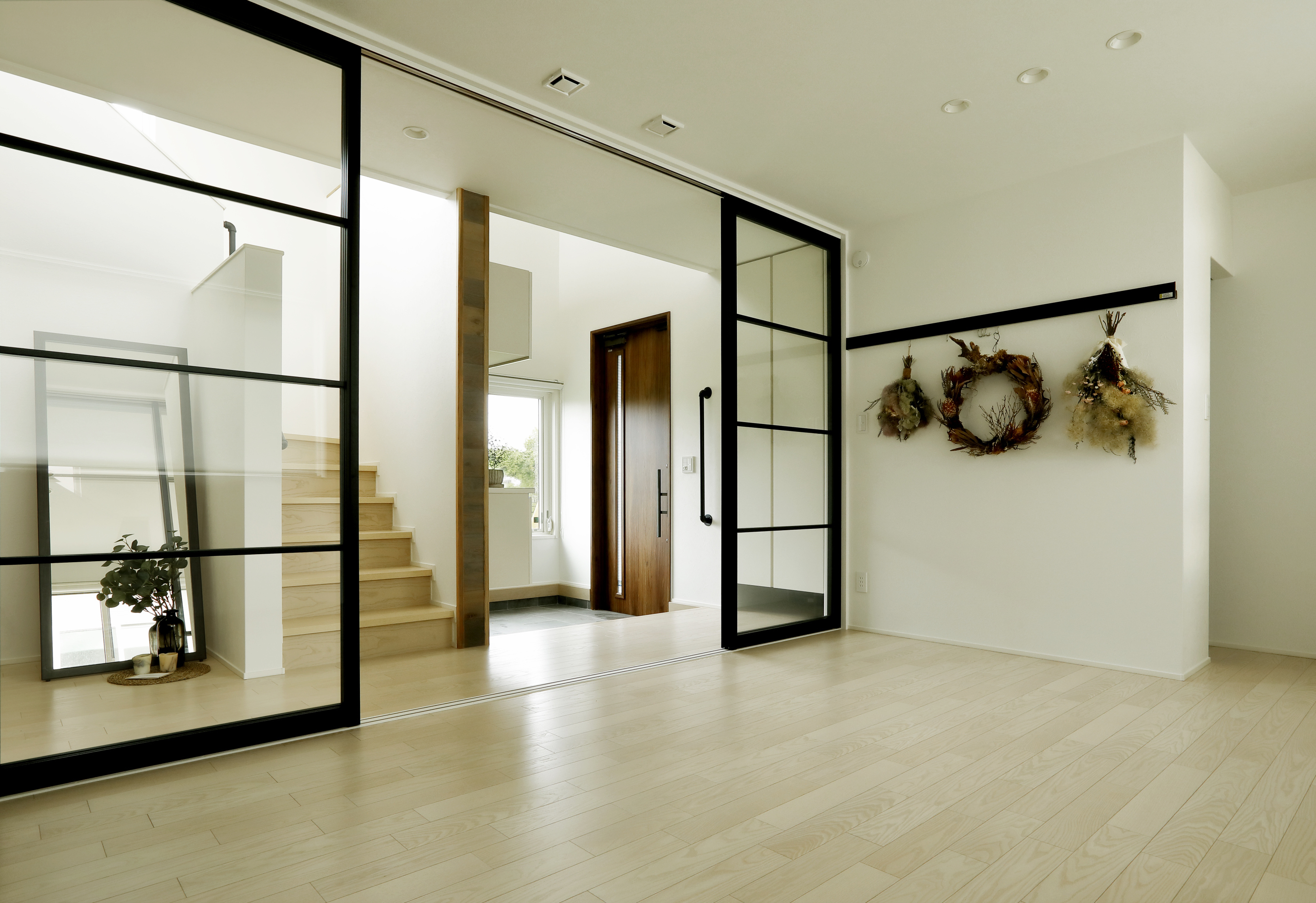 スタジオの入口は、妻・Yさんがこだわった横桟がアイアン調のブラックのシースルー引き戸を使い、空間全体のアクセントに。ガラスがクリアなので、区切った空間でありつつも、玄関ホールや階段室からの自然光を取り込めるため、とても明るいスタジオになりました。また、スタジオの一画(写真右奥)には、生徒さんのための荷物置き場を用意。クローゼットのようにハンガーパイプを渡し、着替えスペースとしても活用できるようにしました。