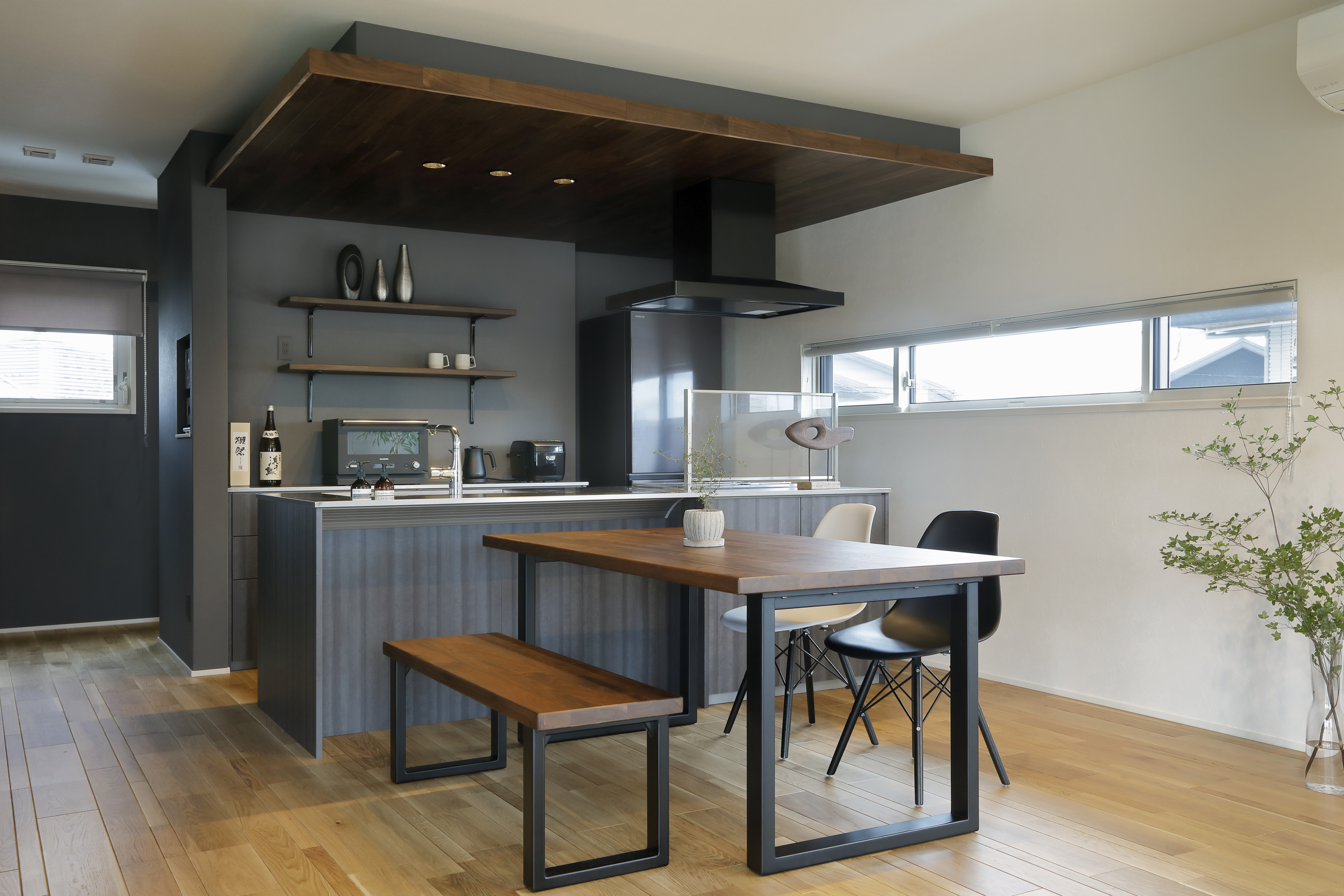 また、天井を下げて、ウォールナットのフローリング材を張った仕様にし、色を合わせたダイニングテーブルとベンチを置くことに。
