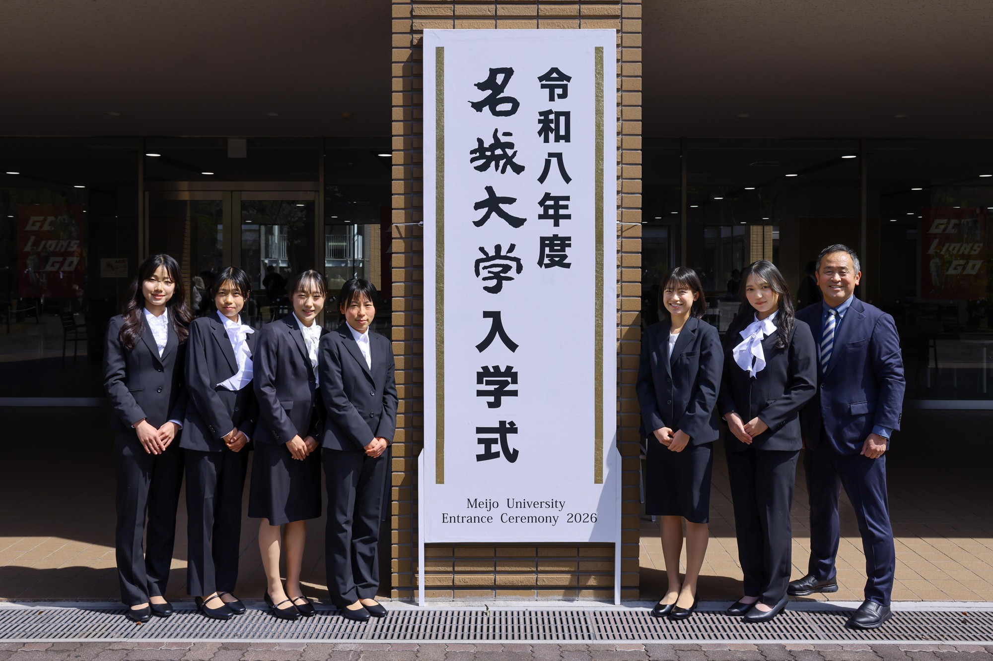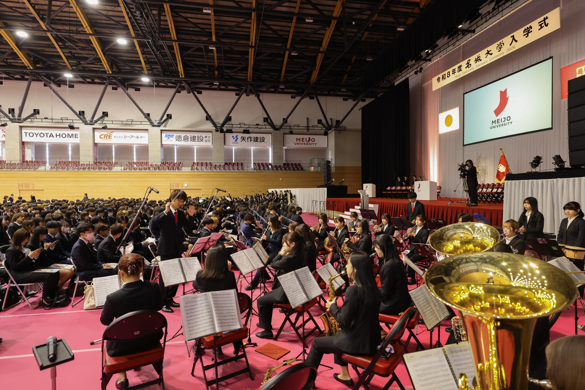 式の開会前には應援團吹奏楽部と名城大学管弦楽団の演奏で新入生を会場に出迎え、式では「名城大学アカペラサークルはもりね」の歌声と名城大学管弦楽団の演奏とともに、新入生が初めて学歌を斉唱しました。名城大学管弦楽団は式の最後にエルガー作曲「威風堂々」を演奏して新入生を歓迎しました。