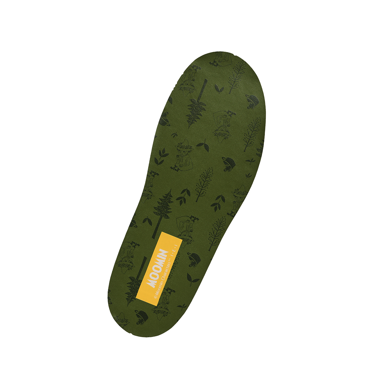 ■中敷きに広がる楽しいデザイン。森の木々とともにスナフキンやニョロニョロの姿も...リーフグリーンとカーキの2色コンビ。キズや汚れが目立たない独特なシボの表情も魅力です。