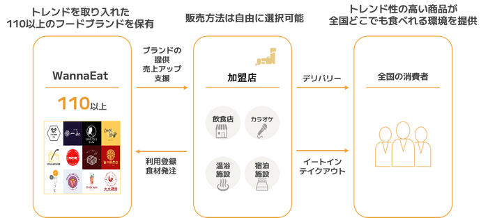 当社は話題のスイーツ・ドリンクや人気店の料理など110種類以上のフードブランドを開発しています。「フーシェア」は飲食店のほか、カラオケや温浴施設など飲食店営業許可を持つ全国の店舗・施設が加盟店となり、フードブランドを店舗のメニューとしてイートインやテイクアウトで消費者に販売できるほか、デリバリープラットフォームでも販売可能なサービスです。