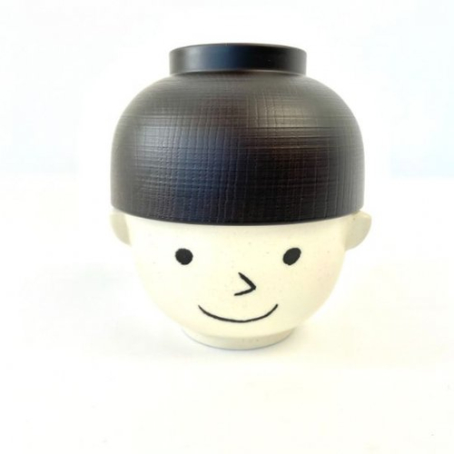 つづいてはイケメンくんの食器です。こちらはまんぷくシリーズのモノとなります、名前はまんぷく一郎。高い鼻が自慢♪ニッコリとした爽やかボーイです。帽子が汁椀、お顔が茶碗になっています。お顔には耳も付いていて造りが細かいですよね!