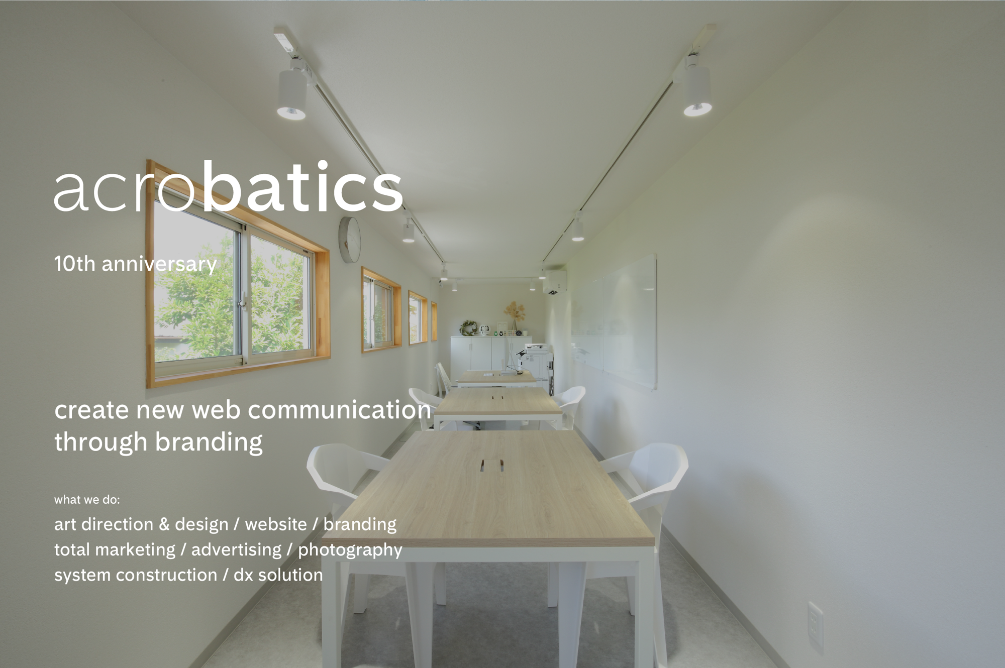株式会社アクロバティックスはリクルートや楽天を経験した代表が立ち上げたクリエイティブカンパニーです。宿泊施設を中心に多彩な集客方法を駆使したウェブマーケティング事業や自治体や企業などからリクエストされる業務改善のためのDXソリューション事業、ホームページの構築や映像制作、ウェブ広告を活用したプロモーションを中心としたウェブ制作事業などを展開し成果を上げています。