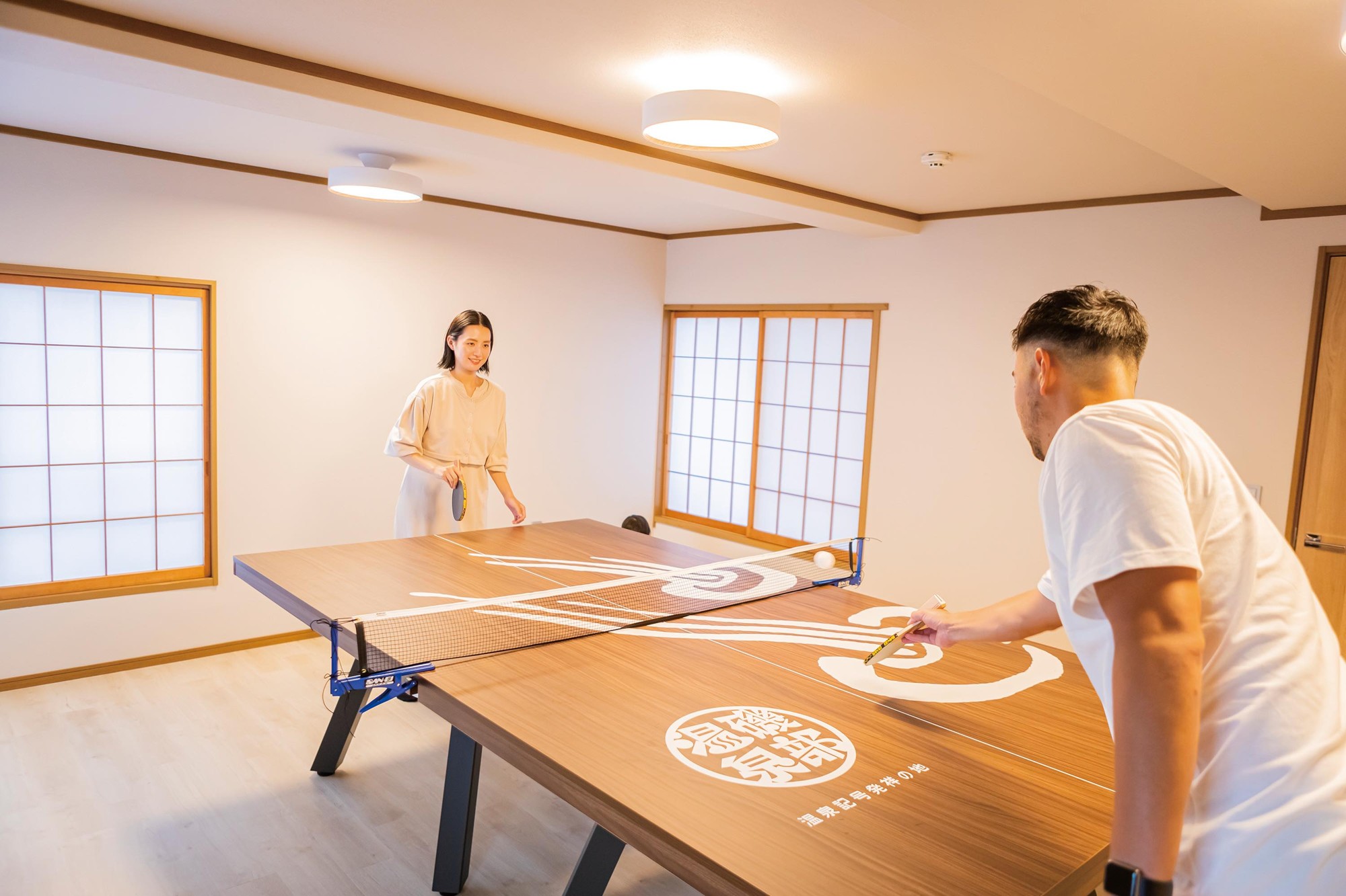 開業した新スタイル旅館では、玄関ドアには宿泊者それぞれに自動で割り当てられた暗証番号キーを入力して入室するIoT技術を取り入れ、広々としたリビングに琉球畳を配した和室、温泉記号発祥の地である磯部温泉のロゴをあしらった卓球ルーム、BBQ が楽しめるウッドデッキなど、お客さまだけのプライベート空間を守れる宿泊スタイルを実現しています。