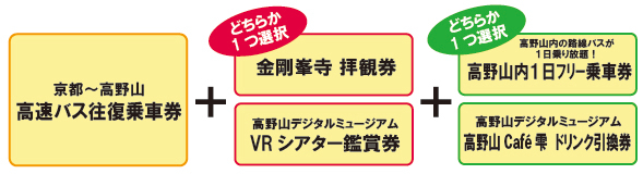 3.商品内容 京都-高野山を結ぶ高速バスの往復乗車券に、高野山の観光施設利用券を