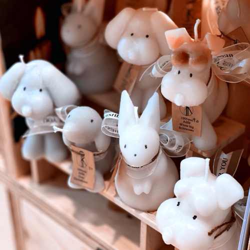 お寺で不要になったろうそくが、アロマ優しく香る犬型キャンドルに大変身! あなたの時間をあたたかく彩ります。 東京藝術大学卒の油画と建築科のユニットによる、犬や花の形のオリジナルキャンドルを販売。また、オリジナルキャンドルづくりのワークショップも実施します。