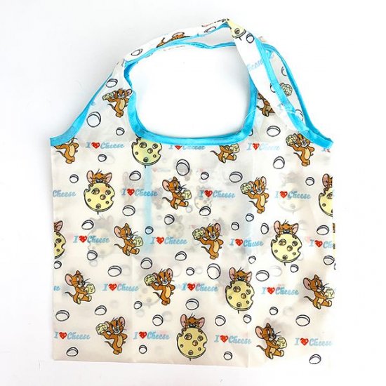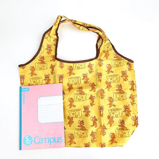 こちらは、イエロー地にジェリー&チーズデザインのエコバッグです。チーズの上に乗っかったり、いろいろなポーズのジェリーが総柄になっていてオススメのデザイン♪