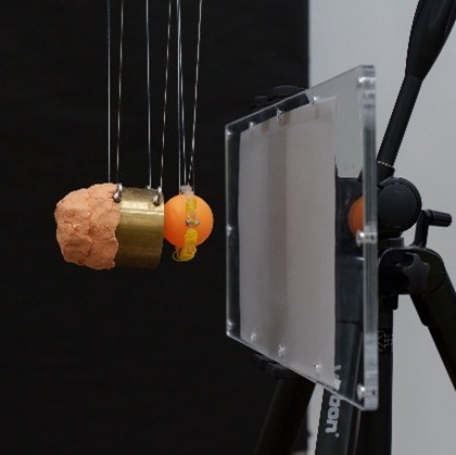 装置:物体を吊り下げて往復運動させ、壁との衝突と2物体間の衝突をカウント。