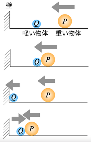 例えば、重さの比が1:1の2つの物体を用意して、片方の物体Pを止まっている物体Qにぶつけると、物体Qは動き出します。物体Qは壁にぶつかり、跳ね返ってまた物体Pとぶつかります。これ以上の衝突は起こらないので、合計3回の衝突が起こったことになります。これが、円周率3.14…の最初の3に対応します。