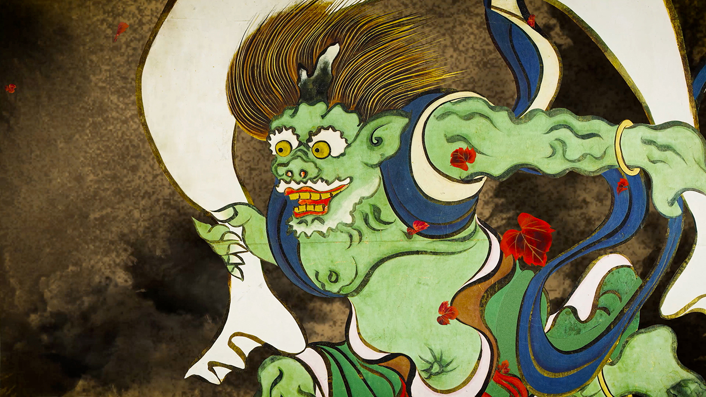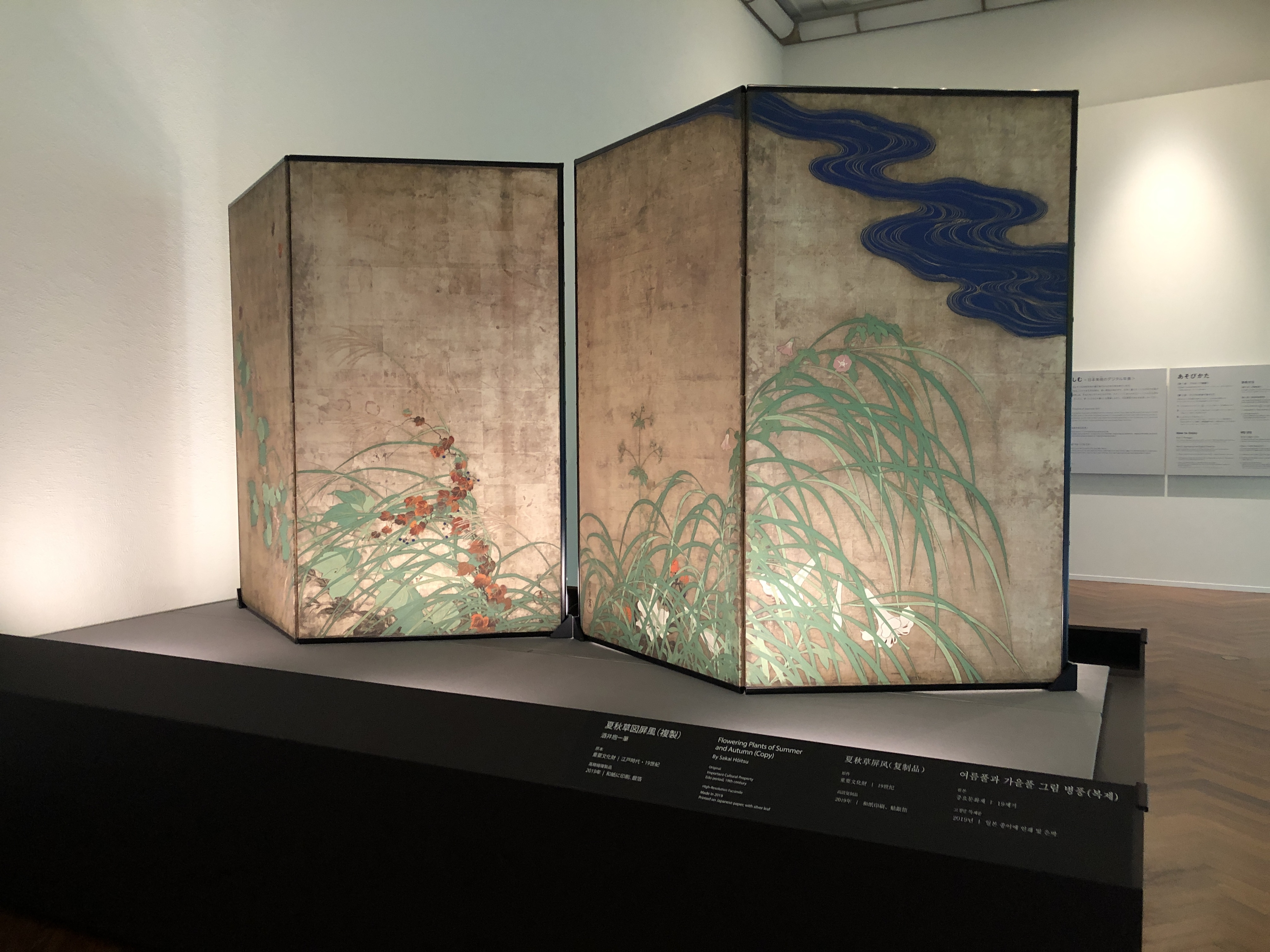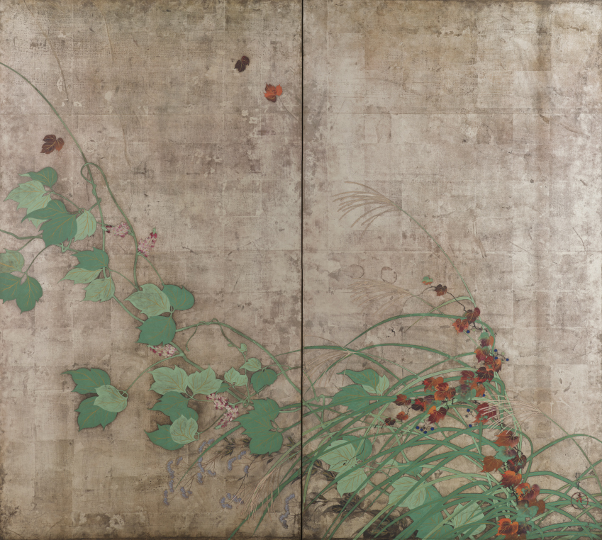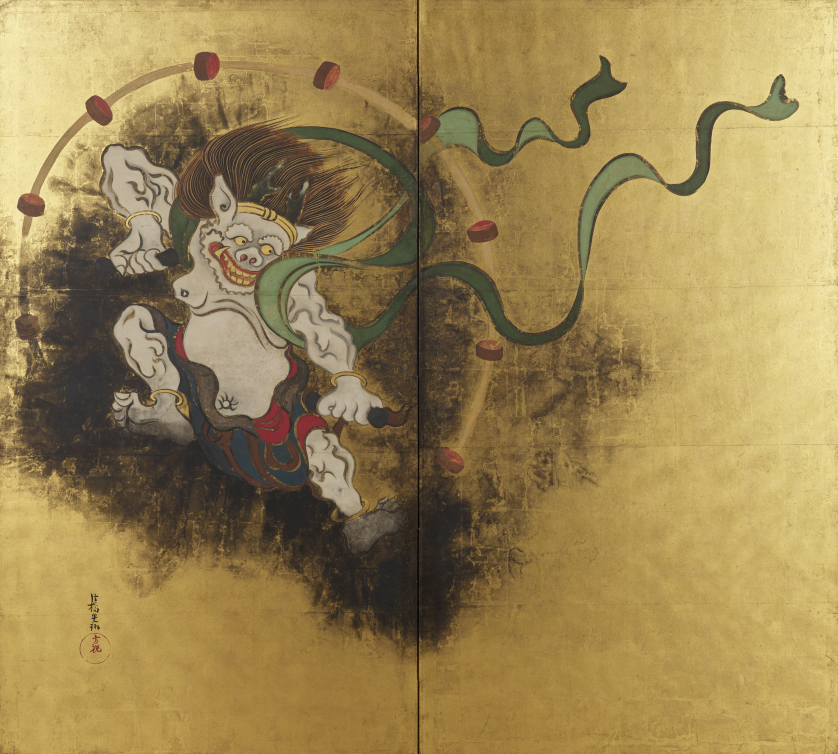 現在は保存のために別々の屏風に仕立てられている重要文化財「風神雷神図屏風」(尾形光琳筆)と、重要文化財「夏秋草図屏風」(酒井抱一筆)。光琳が風神雷神図を描いた約100年後、その裏側に抱一が夏秋草図を描きました。複製ではかつての姿のように、表裏一体となっています。*2021年8月29日まで展示予定