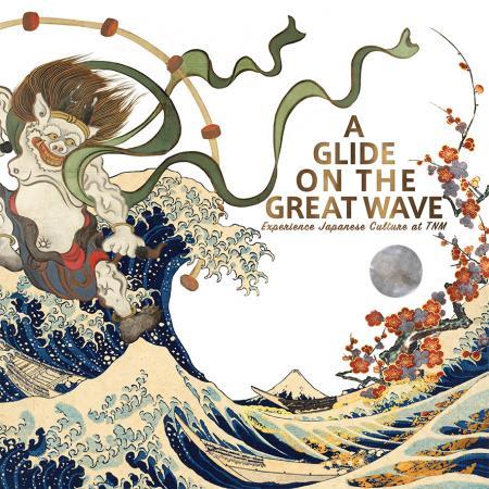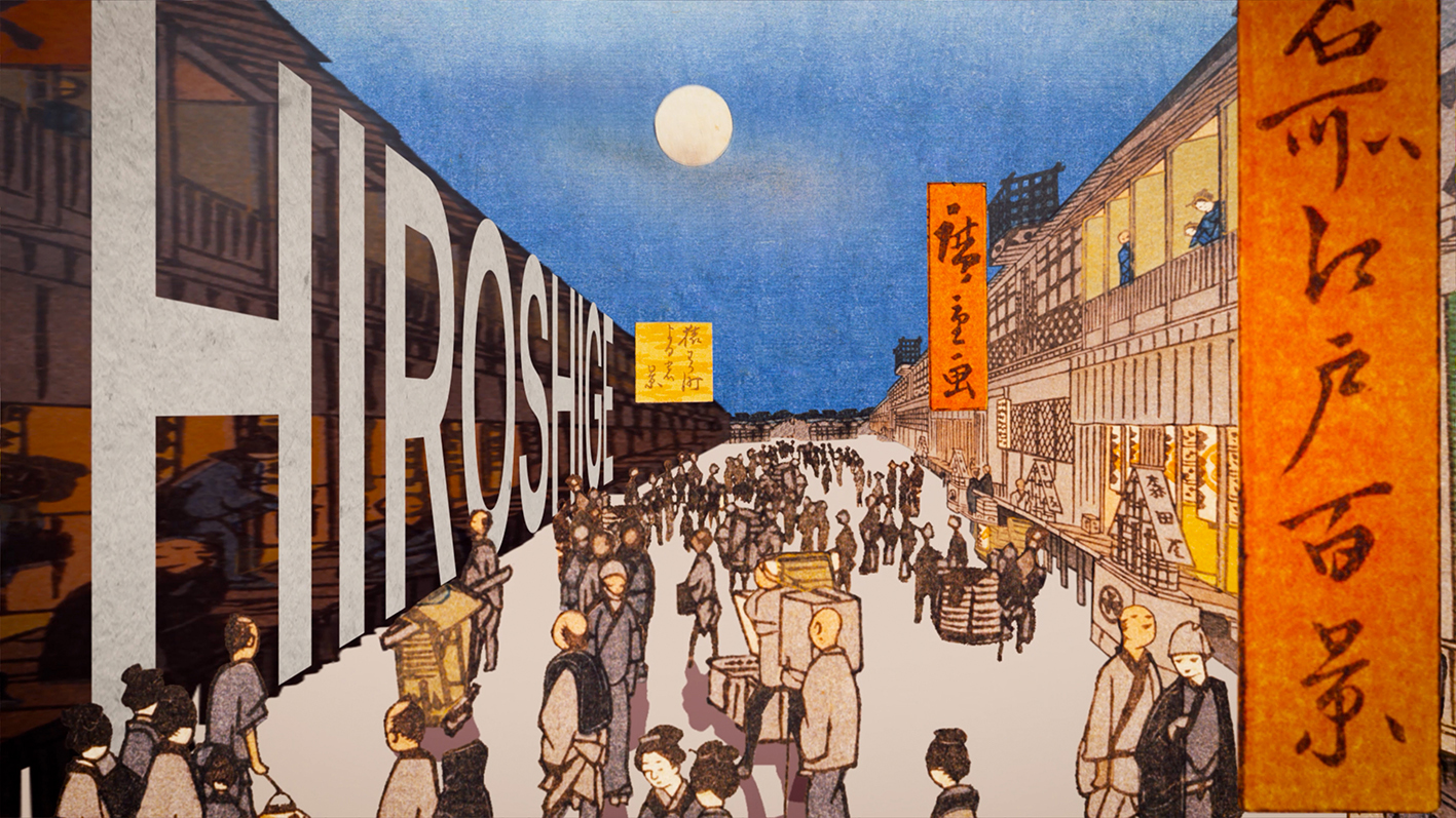 日本美術を知る旅のはじまりに、トーハクのコレクションを代表する数々の名品で構成された映像「日本文化紹介映像 A GLIDE ON THE GREAT WAVE」をご覧いただきます(約8分)。日本の美意識は、四季折々の風景や、伝統行事を楽しむ人々のいとなみのなかで育まれてきました。映像は、浮世絵に描かれた<江戸>の町と、私たちがいる<東京>をダイナミックに行き来しながら、変わることなく今に続く美意識を描いています。