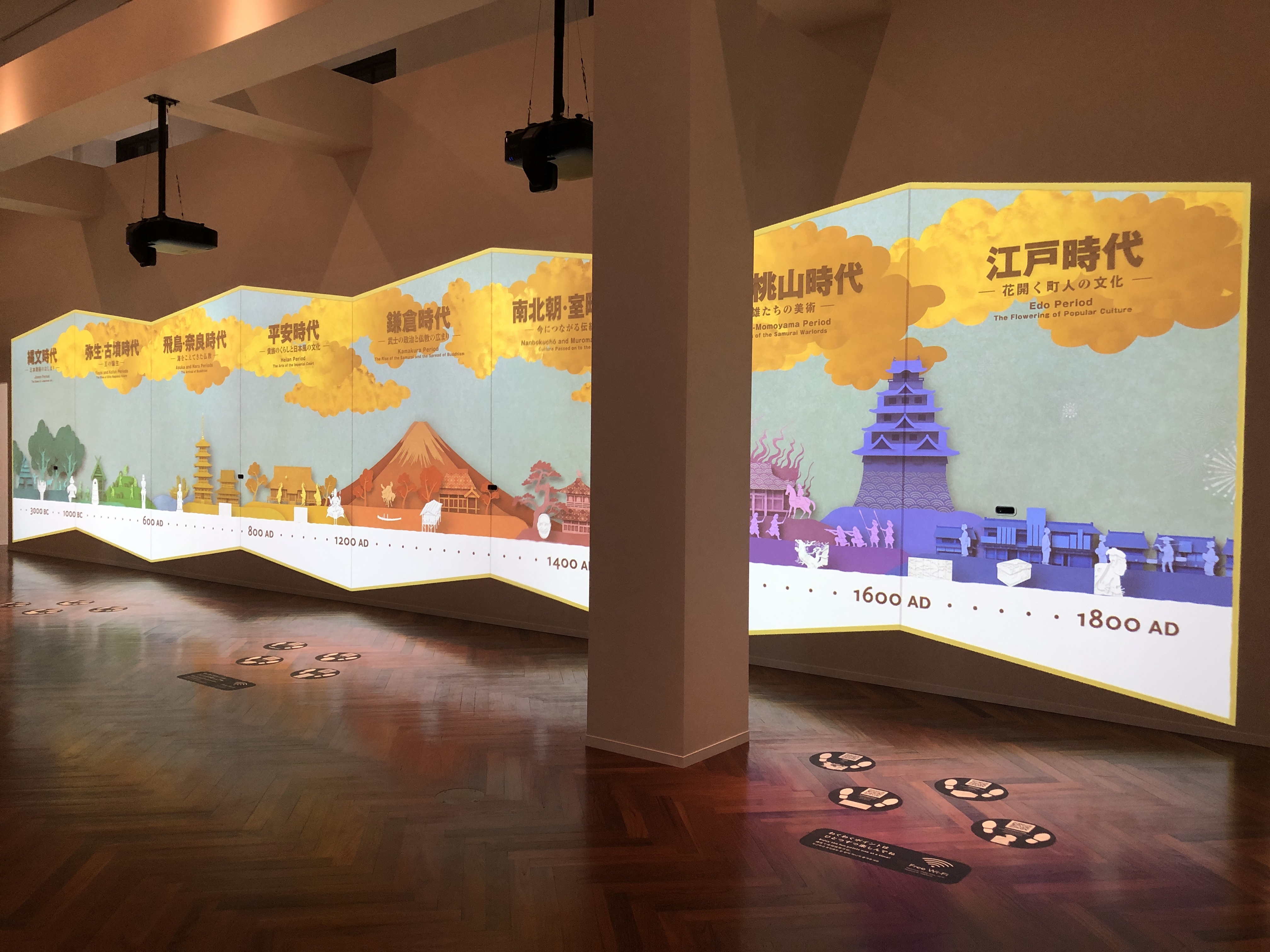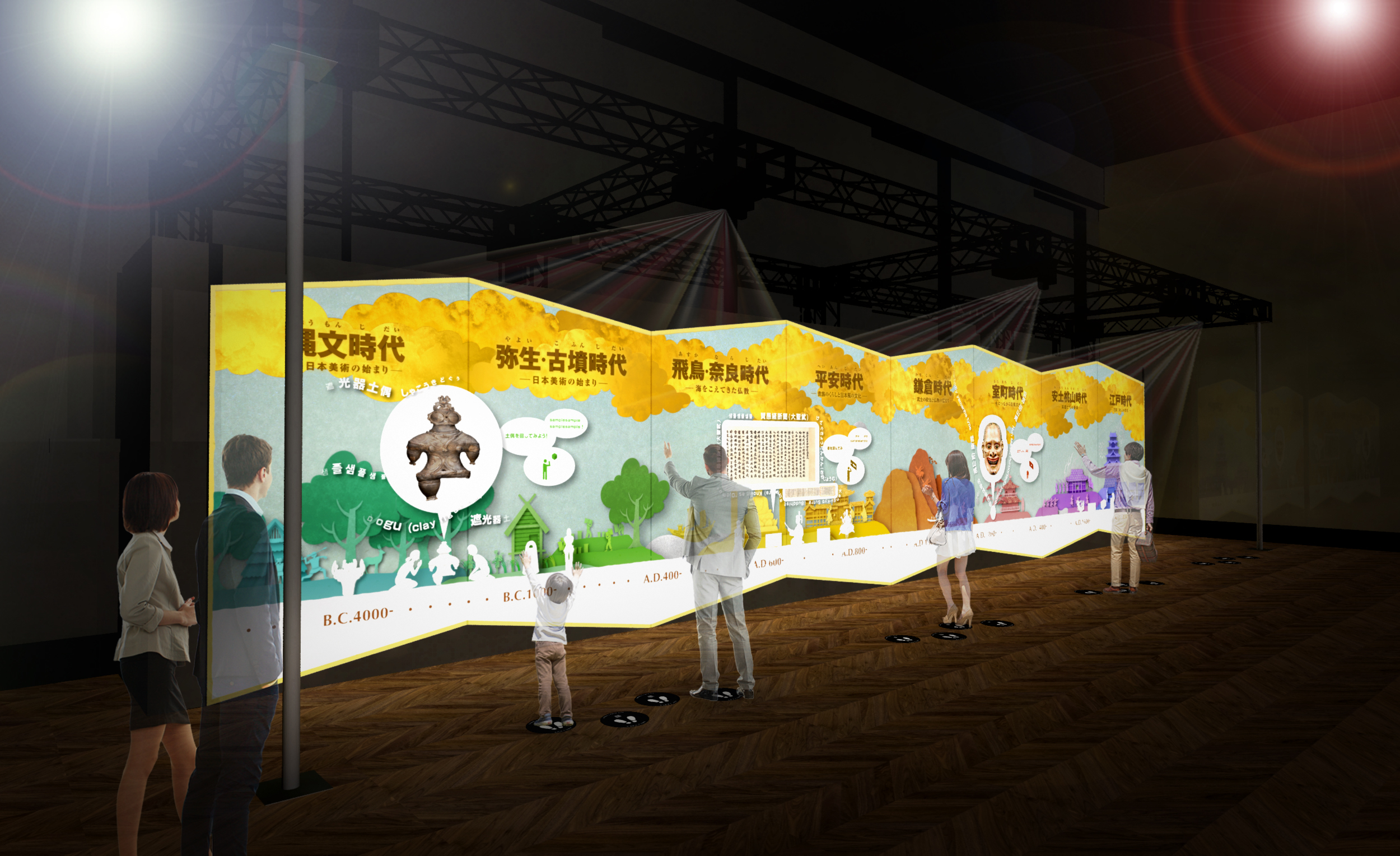 幅14メートルの巨大スクリーンいっぱいに、およそ1万2000年前の縄文時代に始まる日本の美の流れを、デジタル年表で紹介します。オープニングムービーの後、トーハクの代表的な16の作品が表示されます。それぞれの作品と連動した「わくわくポイント」に立つと作品画像がポップアップされ、回転したり、拡大したり、ページをめくったりすることができるインタラクティブな体験コンテンツです。作った人、使った人の心や暮らしを想像しながら、日本美術史を体感できます。