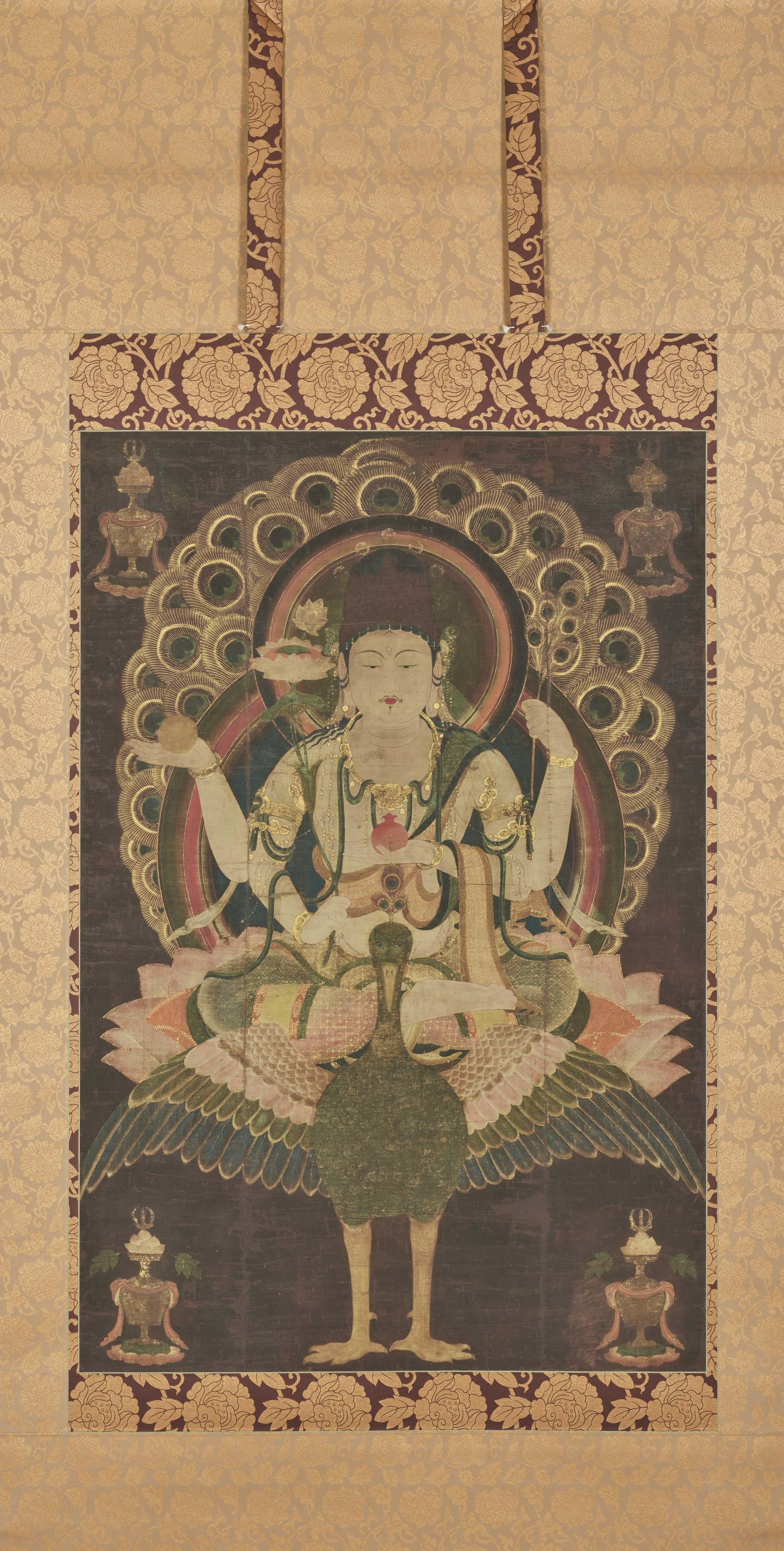 現存する孔雀明王像の中でも最高傑作とされる国宝「孔雀明王像」は、華やかな彩色が目をひき、ハイライトや色のぼかしを巧みに加え、柔らかでふっくらとした印象を生み出しています。しかし作品保護のため、本物の作品を明るい光のもと見ることはできません。高精細複製品では彩色の忠実な再現とともに金の表現もお楽しみいただけます。