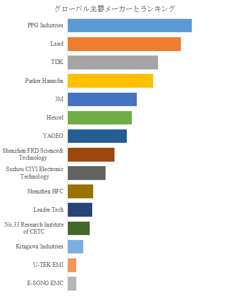 企業レベルでは、世界の主要プレイヤー――たとえば PPG Industries、Laird、TDK、Parker Hannifin、3M、Hexcel など――が市場のかなりのシェアを占めており、高い技術力とグローバルな供給・販売ネットワークを武器に競争優位を維持している。これら企業は、伝統的な吸収材だけでなく、軽量化・薄型化・広帯域化に適した複合材料や高機能ポリマー、環境配慮型素材などの新製品開発に注力しており、用途の多様化と市場拡大を同時に進めている。また、中国の Shenzhen HFC や Shenzhen FRD Science & Technology、その他新興企業もコスト競争力と地域特化によって市場参入を加速しており、世界市場は“グローバル大手 + 地域新興企業”という二極構造で、しかし用途と技術で多様化する競争環境にある。
