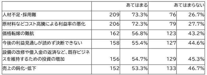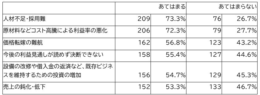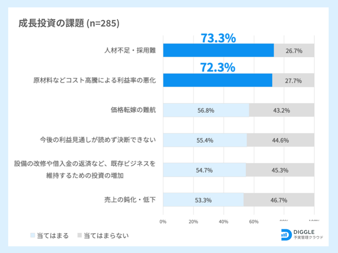 ・成長投資の課題で多いのは「人材不足・採用難(73.3%)」と「原材料などコスト高騰による利益率の悪化(72.3%)」