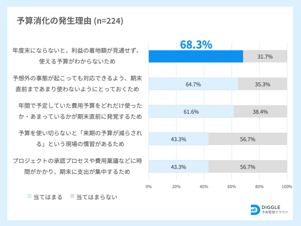 ・予算消化の発生理由でもっとも多いのは「年度末にならないと、利益の着地額が見通せず、使える予算がわからないため(68.3%)」