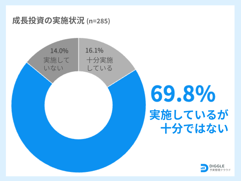 ・成長投資の意欲が高い経営者の69.8%が、「実施しているが十分ではない」と回答。「実施していない」を合わせると85.9%が十分に投資が行えていない状況