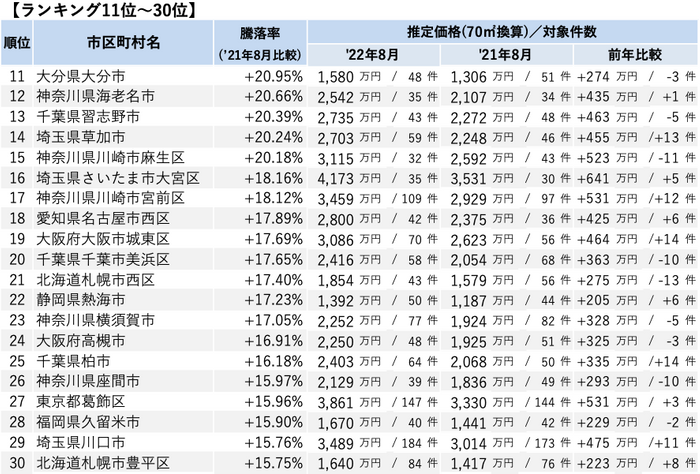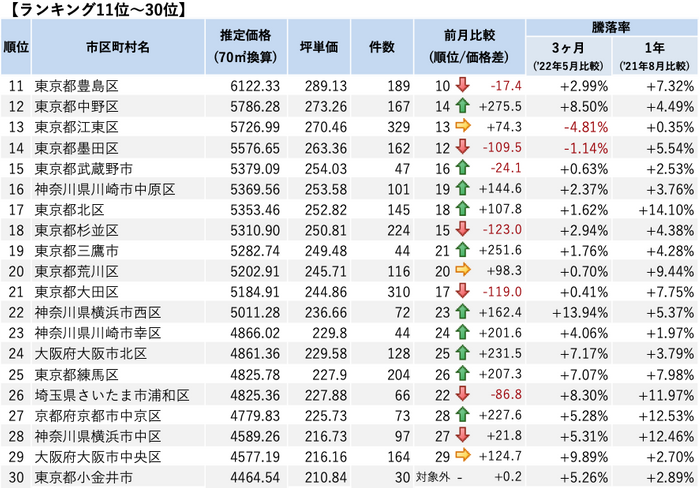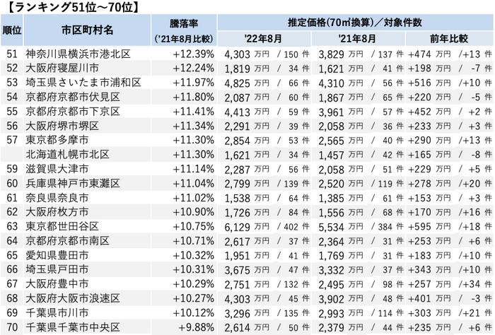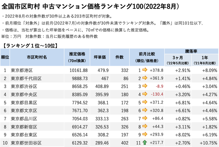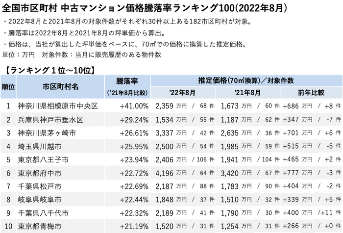「不動産×WEB×ビッグデータ」の領域で、さまざまな不動産テックサービスを展開する株式会社ワンノブアカインド(本社:東京都港区、代表取締役社長:川島 直也、以下当社)は、当社が運営するマンション情報サイト「マンションレビュー」の保有データを元に、2022年8月の全国市区町村における中古マンションの相場を調査。坪単価をベースに70㎡での価格に換算した「中古マンション価格」*1および1年前と比較した価格の上昇率を表す「騰落率」のランキング100を発表いたします。