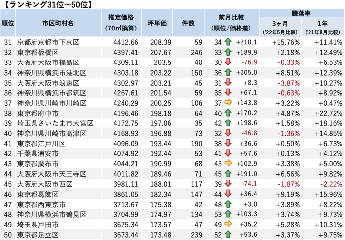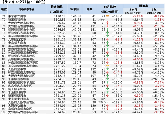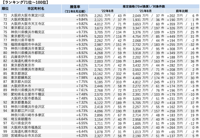 ・100位以内の市区で、前年(2021年8月)と比較して価格が上昇したのは82市区。なお、3ヶ月前(2022年5月)と比較して価格が上昇したのは79市区、前月と比較して価格が上昇したのは72市区。