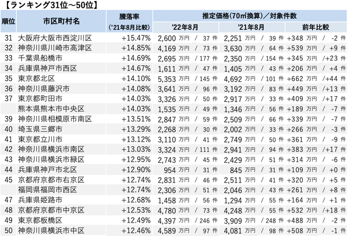 ・全国1位は「神奈川県相模原市中央区」で+41.00%。前年と比較し、70㎡換算の推定価格は約700万円上昇。