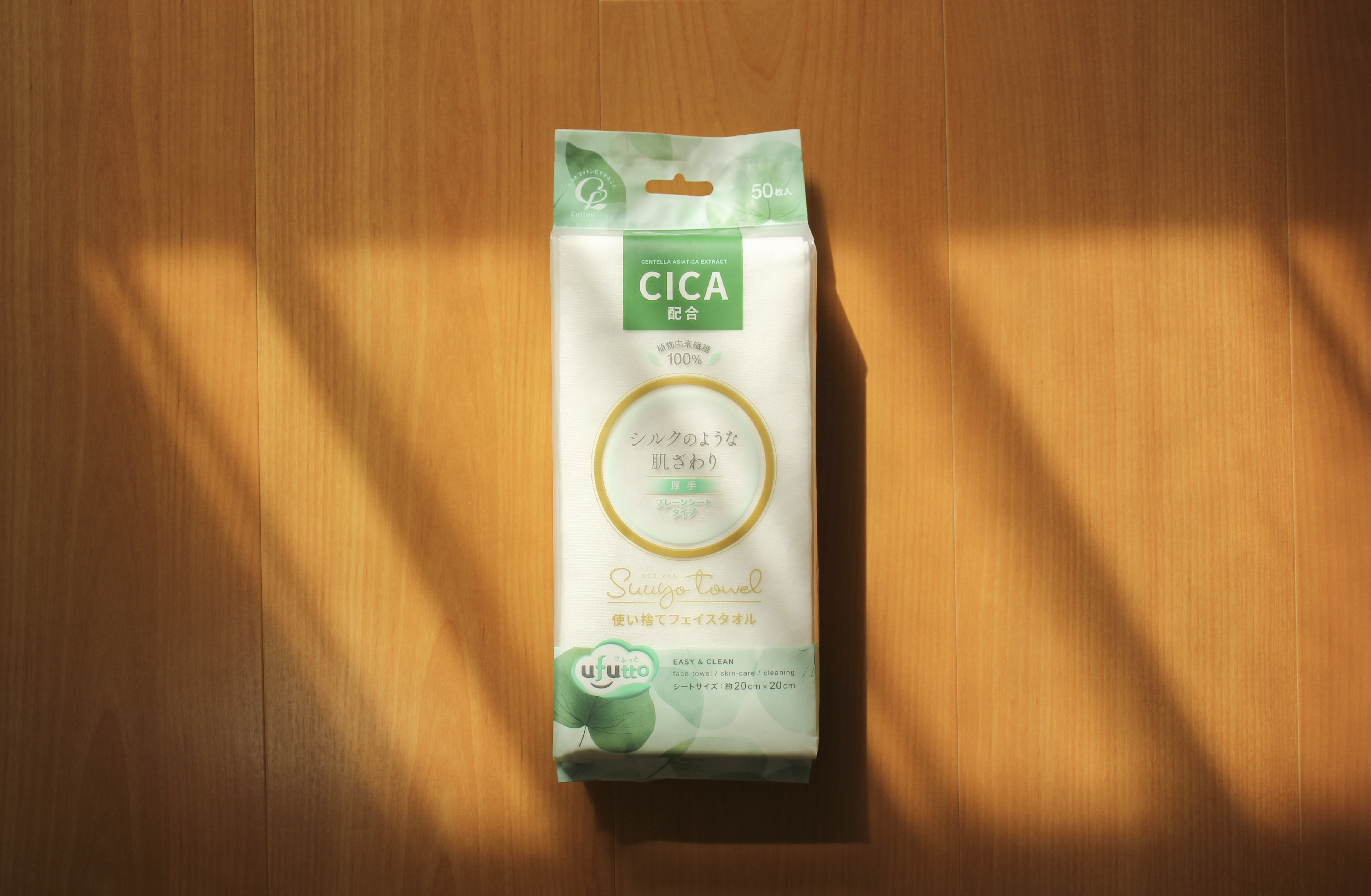 『ufutto スウヨタオルCICA』は、「シルクのようになめらかな肌ざわり」をコンセプトにうるおいを閉じ込めた使い捨てフェイスタオルです。