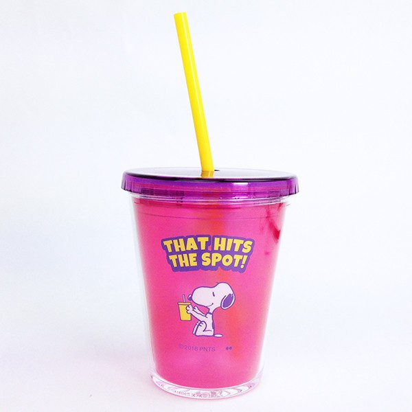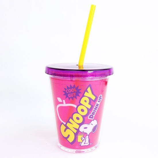 ストロー繋がりということで、こちらもご紹介♪ストロー付きのタンブラーです。ピンクの本体にスヌーピーのPOPなデザインが楽しいですね。アップル柄もキュートです。