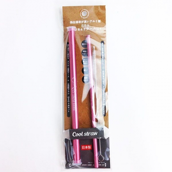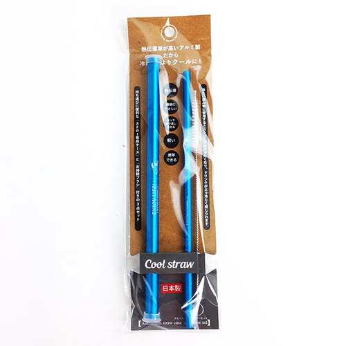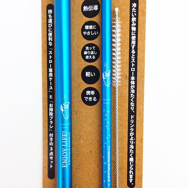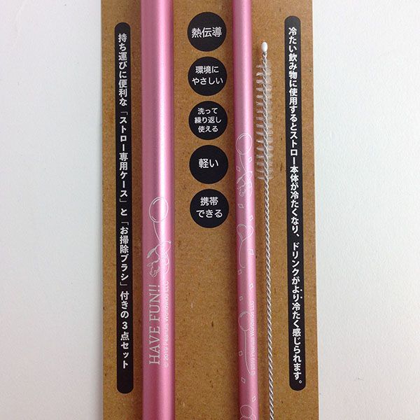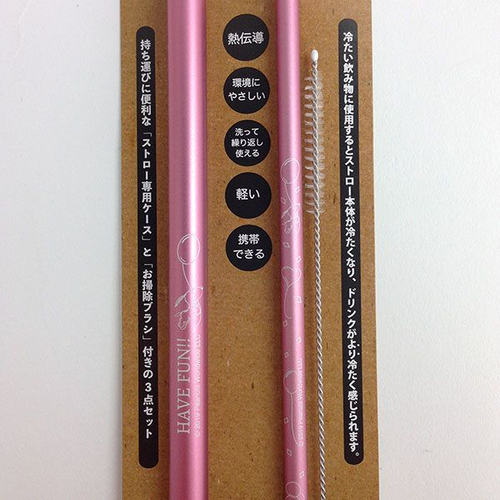 こちらがその、アルミストローです。真ん中にあるのがストローで、左側はケースなので携帯もできちゃいます。右側には洗浄用のブラシもついているので、洗って何度も使えるんです。衛生的に使用できますね。熱伝導率の高いアルミ製なので、冷たい飲み物がさらに冷たく感じるという優れもの♪