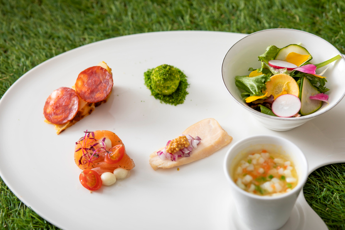 【冷製】具だくさんの茶わん蒸し(温製) / ゴロゴロナッツのチーズボール / イベリコチョリソのスパニッシュオムレツ / 鶏のラビゴットソース / 彩り豊かなシーザーサラダ / サーモンマリネ トマトジュレとモツァレラチーズ