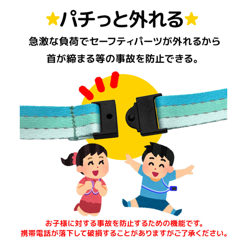 急激な荷重がかかると、セーフティーパーツが外れるから首が締まる等の事故を防止でき、安心してご使用出来ます。