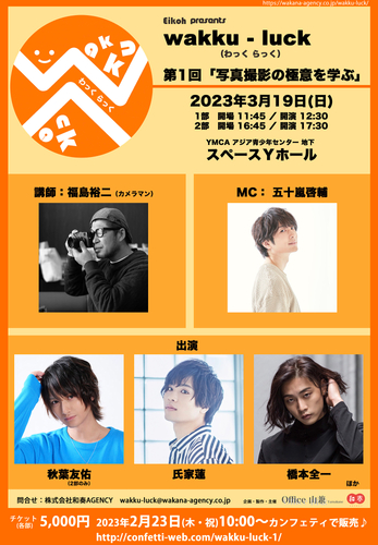 俳優と観客が一緒に学べるイベント「wakku-luck」開催決定 第1回はカメラマン福島裕二氏を迎えて『写真撮影の極意を学ぶ』 カンフェティでチケット発売