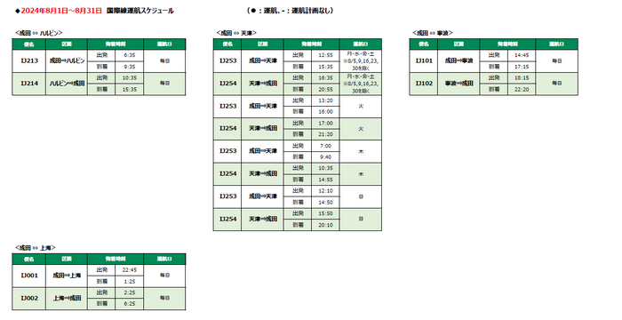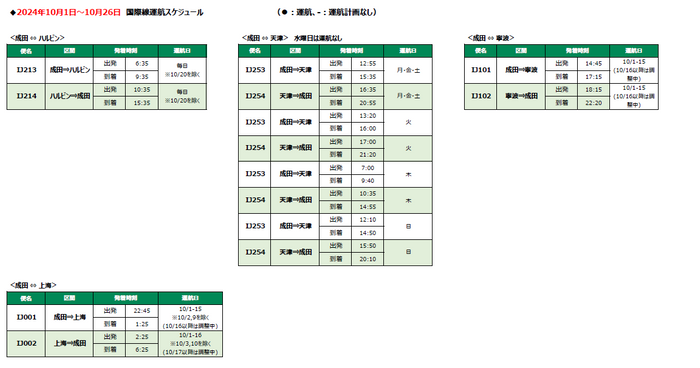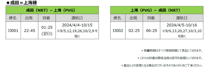 スプリング・ジャパン 2024年夏ダイヤ 上海線の販売開始について スプリング・ジャパン株式会社 2024-04-02 10:00 JALグループのLCCであるスプリング・ジャパン株式会社(以下:スプリング・ジャパン)は、本日10時より、2024年夏ダイヤの成田=上海線の販売を開始します。これにより国際線は成田=ハルビン線、天津線、寧波線と合わせ4路線運航となります。 ダイヤの詳細につきましては、スプリング・ジャパン公式サイトをご覧ください。 IJ国際線の時刻表・フライトスケジュール | SPRING JAPAN SPRING JAPANが運航する国際線の最新のフライトスケジュールを掲載しております。お客様の旅行の計画にお役立ていただけます。 https://jp.ch.com/flights/new-a-time-table-1 ジャンル: 旅行・お出かけ 画像一覧 一括ダウンロード