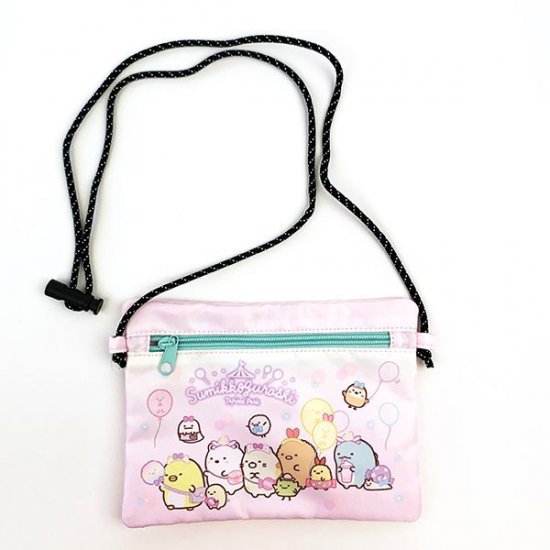 サコッシュは4色展開となっております。もともとは大人のファッションから流行したサコッシュ。軽くて薄いサコッシュはライブやアウトドア、テーマパークに持ち歩きやすくて今では定番のバッグとしてお店に置かれています。そんなサコッシュがすみっコぐらしデザインになって登場しました♪