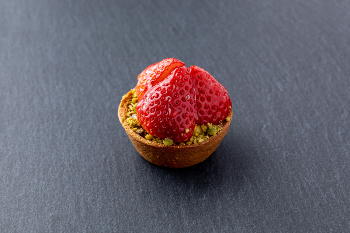 いちごを前面にシンプルにまとめ、ちりばめられたピスタチオが色合い、食感ともにアクセントとなる、いちご本来の芳醇な甘味が引き立つ一品です。