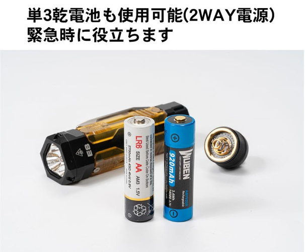 WUBEN【E8】は充電式リチウムイオン充電池に加えて、エネループや市販の単3アルカリ電池も使用可能。