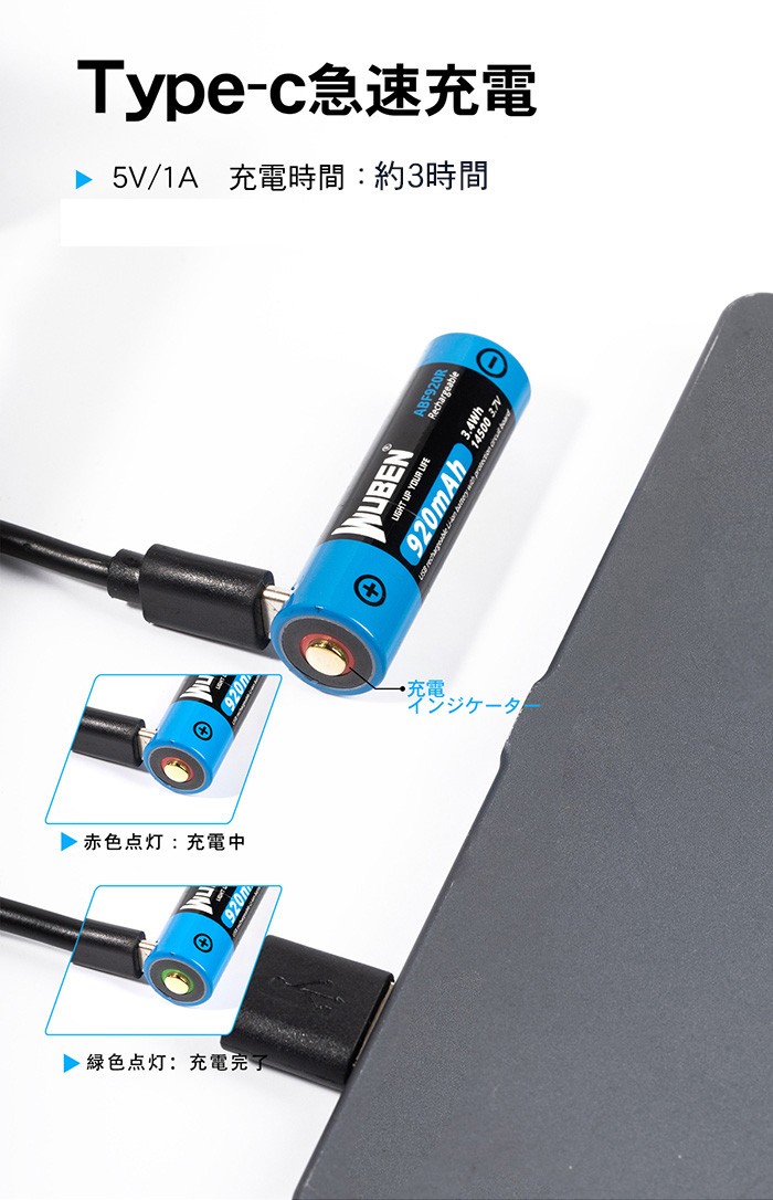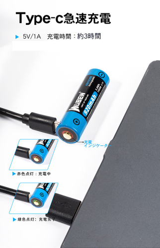 9)Type-C充電ポート搭載 14500-920mAhリチウムイオン充電池付属