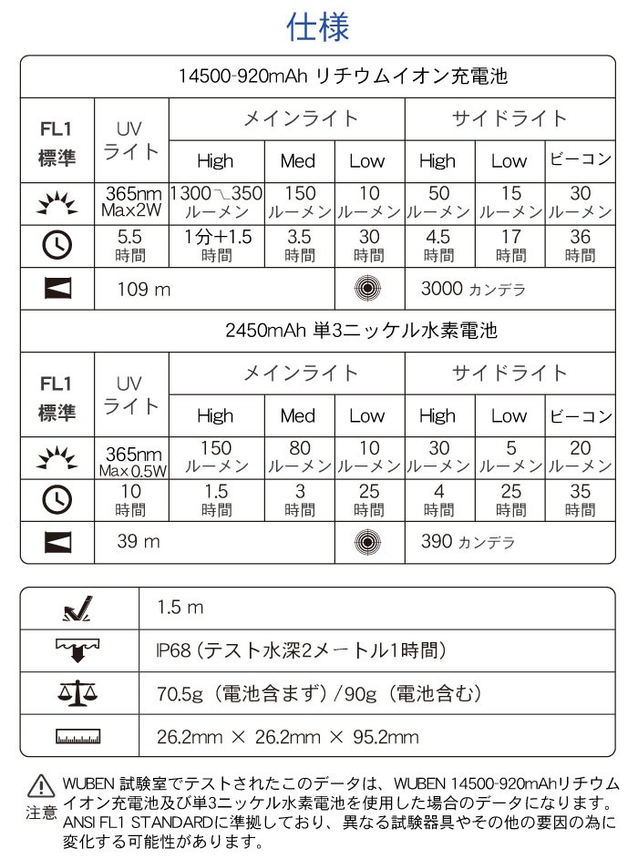 一般的な懐中電灯の明るさは200-400ルーメン程度ですが、WUBEN【E8】はSST-36F LED×2個搭載で、明るさ最大1300ルーメンとかなりの高輝度を誇ります。色温度は5000K(昼白色) で、生き生きとした自然な光色です。最大照射距離は109m。