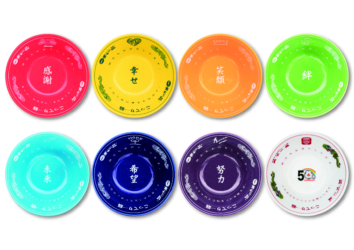 さらに、大好評「スタンプカードキャンペーン」を2020年10月19日(月)~2021年6月27日(日)の252日間、ステージ1からステージ4まで開催いたします。今回は、「明日に虹をかけよう!!スタンプカードキャンペーン」と銘打ち、明るい未来という希望を込め、「虹」をイメージした7色の「レインボーミニミニどんぶり」と、2021年11月に50周年を迎えることが出来る感謝の気持ちを込めて、「虹」のイラストが特徴の「50周年記念ロゴ」が印字された「レインボーミニミニどんぶり(50周年記念ロゴ)」計8種類(各ステージ2種類ずつ)の景品をご用意いたしました。スタンプ5個を集めると、「レインボーミニミニどんぶり」、もしくは、次回ご来店時にご利用いただけるラーメン(並)1杯半額券、どちらかをお選びいただけます。