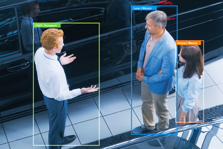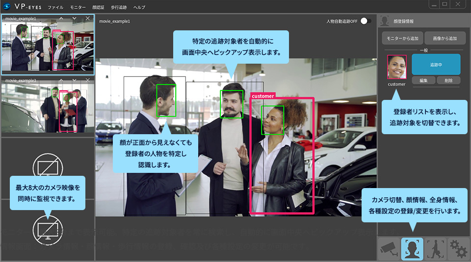 「VP-Eyes」は、AIが人物の顔情報や全身情報を複合的に識別し、顔が完全に映っていない場合でも同一人物と認識するので、登録後の自動追跡が可能です。