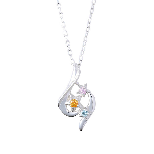 陽毬、光莉、ヒバリのコスチュームの星モチーフを取り込んだ曲線的なデザインに、三人のイメージカラーストーンをセットしました。星のエンドチャームがポイントです。