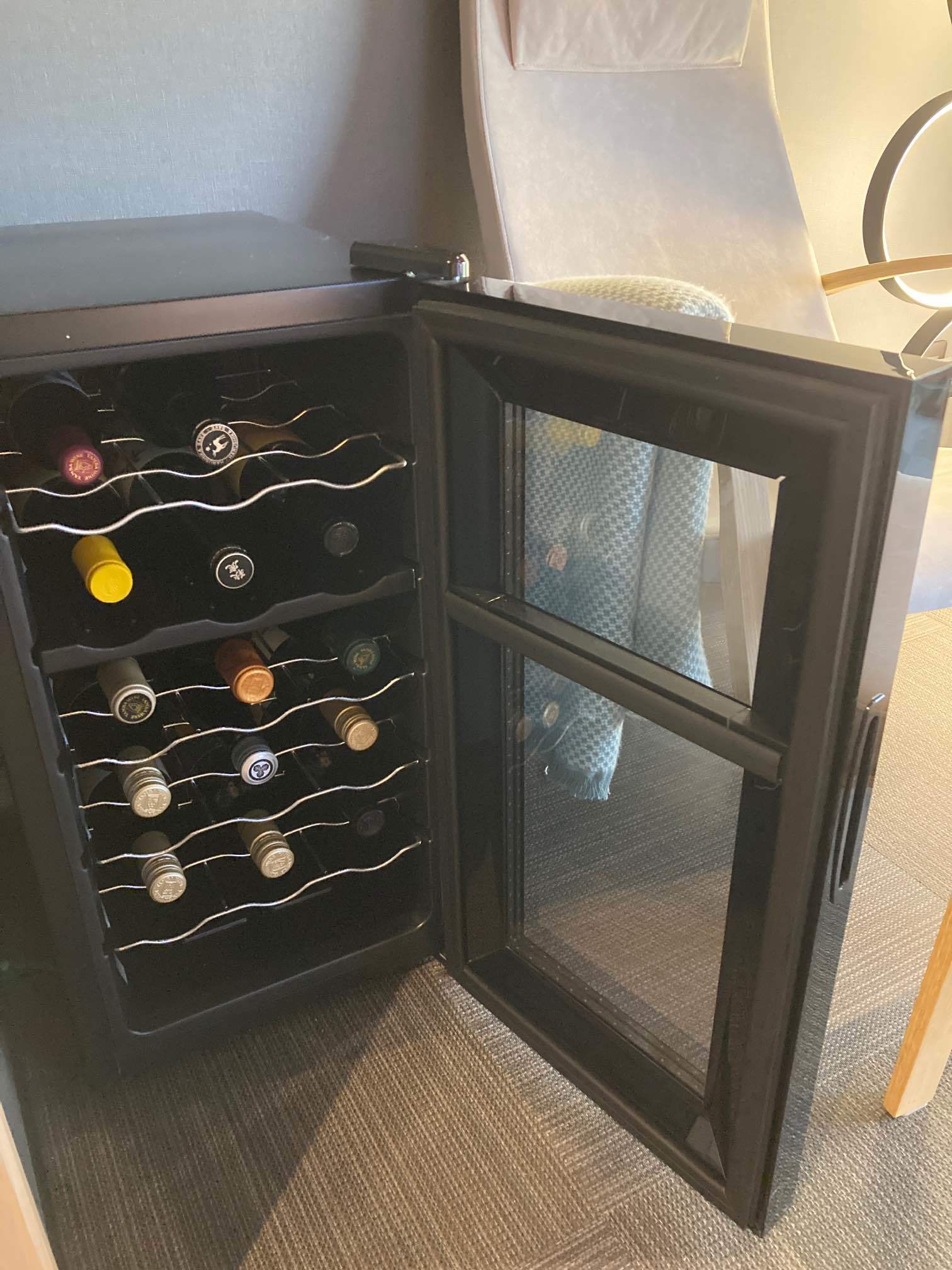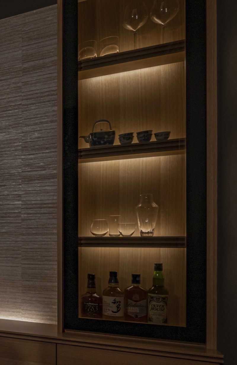 家飲みを楽しむのに大切な「おつまみ」や「お酒のストック」についても、「山本さんち。」は家飲み空間がLDKの隣にあるので、こだわりのおつまみを手作りして持ち込むことができて便利です。また、家飲み空間にお酒やグラスを収納できる棚があるため、お酒を取りに何度もキッチンと行き来をしなくても済みます。この棚はディスプレイにもなるよう扉がガラスになっているため、並べたグラスやお酒の瓶が“バル感”を一層高めてくれます。さらに、小さな冷蔵庫やワインセラーを置くことで、冷やして飲みたいビールやワインなどもこの空間にストックしておけるようになります。