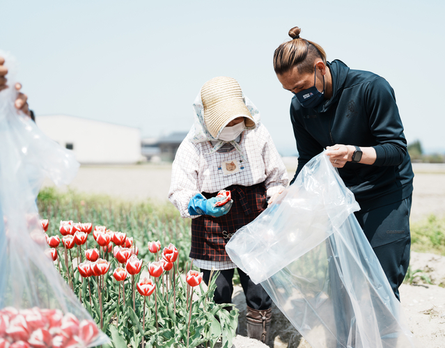 摘み取ったお花は、4月29日にカターレ富山の試合会場である富山総合運動公園、30日には国宝瑞龍寺、富山県環水公園、太閤山ランド、富山県庁前公園、富山駅前広場、富山県内各所をフラワーカーペットで彩ります。球根栽培用に摘み取られた花も、輝く場所を創りたいと考えています。平和を願い描くのは「PEACE」の文字。イベント実施後の花弁は回収し、染料やインクとしてアップサイクルさせ、ワークショップなどの形でお花が紡ぐ未来へのメッセージを伝えます。
