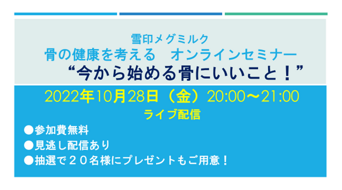 雪印メグミルク株式会社(本社:東京都新宿区、代表取締役社長:佐藤 雅俊)は、骨の健康を考えるオンラインセミナー“今から始める骨にいいこと!”(無料)を、2022年10月28日(金)20時よりライブ配信にて開催します。