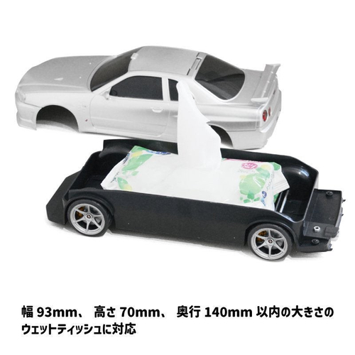 ブレーキキャリパーやホイールの造形もこだわった作りとなっており、使わない時でもインテリアとして飾っておくことができる、GT-Rファンにはたまらないウェットティッシュケースです。